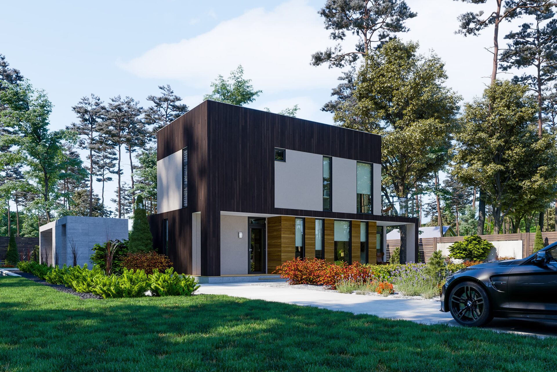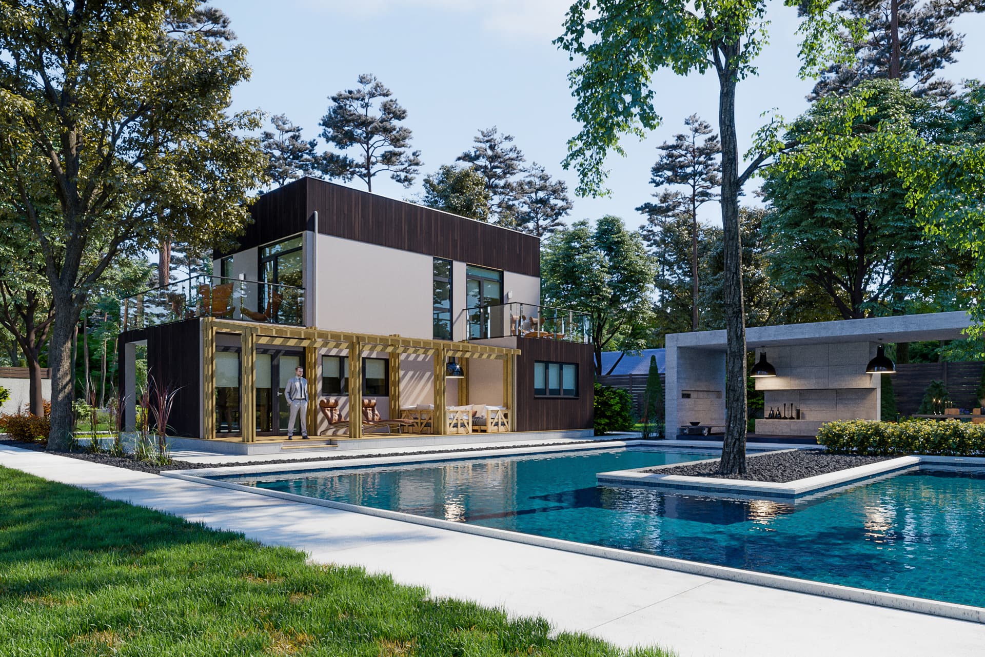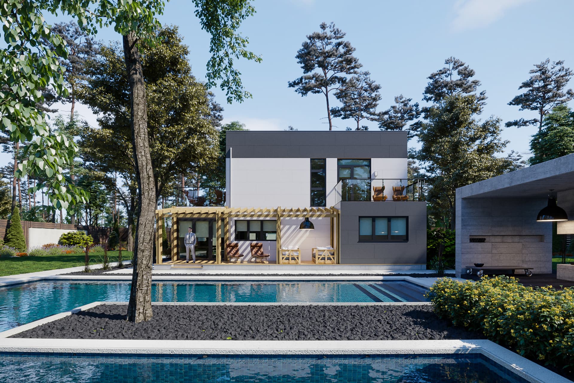 The house is located on a beautiful plot, surrounded by large coniferous and deciduous trees. The client wanted to preserve all the trees on the plot, so the pool was shaped, and the second floor of the house has a terrace in the shadow of the branches.